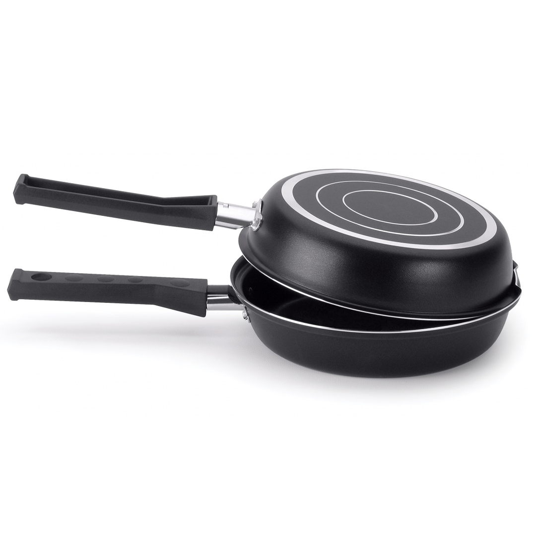 Sartén doble antiadherente fabricada en aluminio, diseñada para cocinar de manera práctica y sin que los alimentos se peguen. Su estructura de 1,3 mm de grosor permite una cocción uniforme y eficiente.